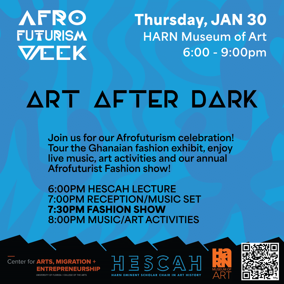 In collaboration with UF’s Center for Arts, Migration + Entrepreneurship, in conjunction with Afrofuturism Week 2025. The evening will include an all-ages fashion show, musical performance by Shine & The Shakers, lite bites, wine/beer/NA beverages, a mobile library, and art-making activities.