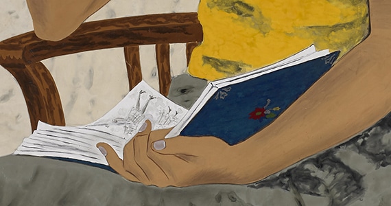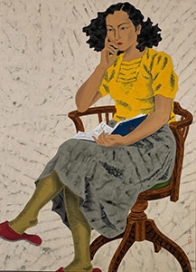 Japan’s modern girls, or moga, lived independently from their families and were financially self-sufficient. The woman seen in this painting is depicted in stylish Western dress, seated atop a swivel chair and lost in thought while perusing a fashion magazine.