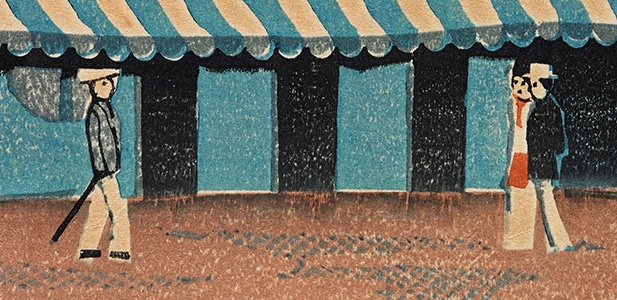 The print seen above is an apt metaphor for this new change: “Break Away” is printed in English across this woodblock print by Nomura Toshihiko. The design of two moga with bobbed-style haircuts in a dance hall was submitted by the artist for the very first volume of the hanga (print) magazine Kitsutsuki, published in 1930.