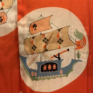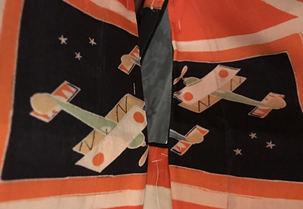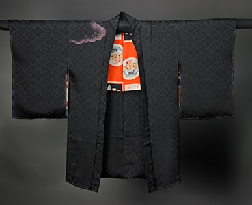 While the jacket-length haori seen here is fairly austere and traditional on the outside, the fabric lining the interior shows all sorts of wild modern patterns featuring new modes of transportation or modern ideas (robots!). These images were designed only to be glimpsed in more casual settings among friends or family.
